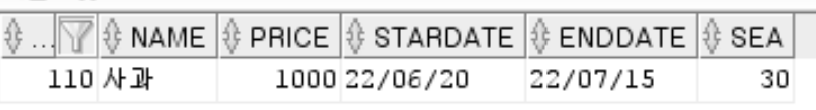 INSERT INTO store VALUES(110,'사과',1000,'22/06/20','22/07/15',30);