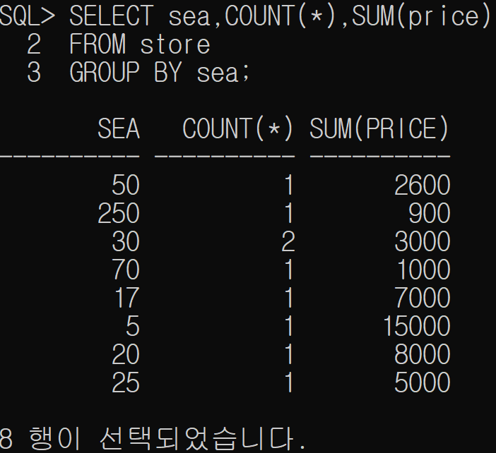 SELECT 절에 집합함수를 사용할 때는 단일컬럼, 단일행 함수를 함께 사용할 수 없다!