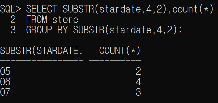 3. 같은 월별로 그룹을 주어야 하기 때문에 SUBSTR(stardate,4,2) 입력한다.