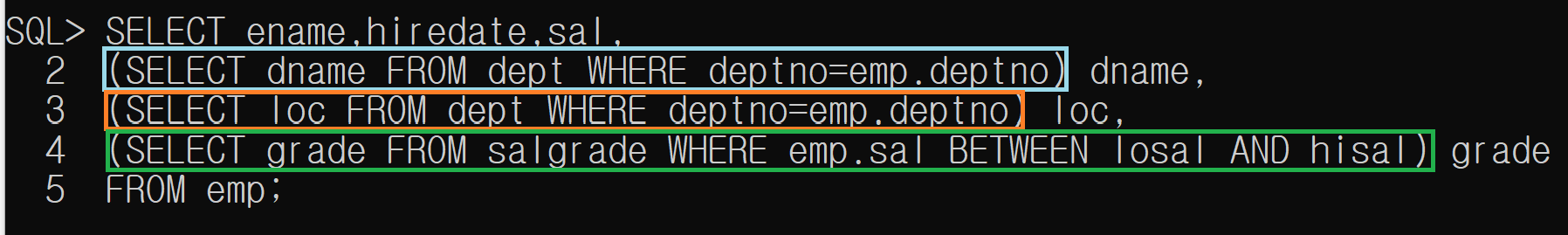 컬럼 대신 SELECT절을 이용하는 것이 스칼라 서브쿼리이다.
