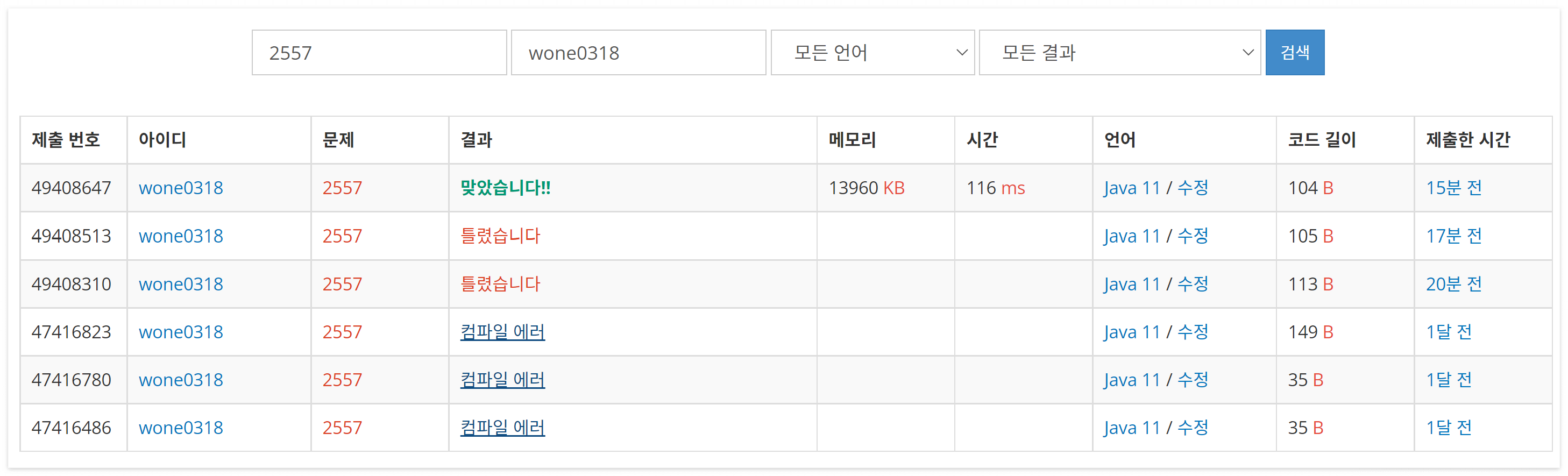 분명 맞게 작성한 것 같은데 돌아오는 결과는 '컴파일 에러' '틀렸습니다' 뿐...