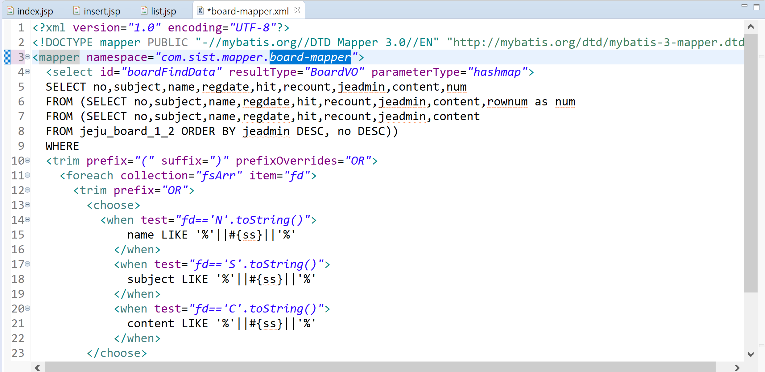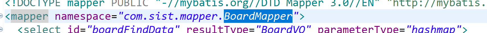 파란색으로 표시된 board-mapper는 해당 xml 을 적는게 아니라! dao로 연결한 mapper을 적어주어야 하는거였다.
