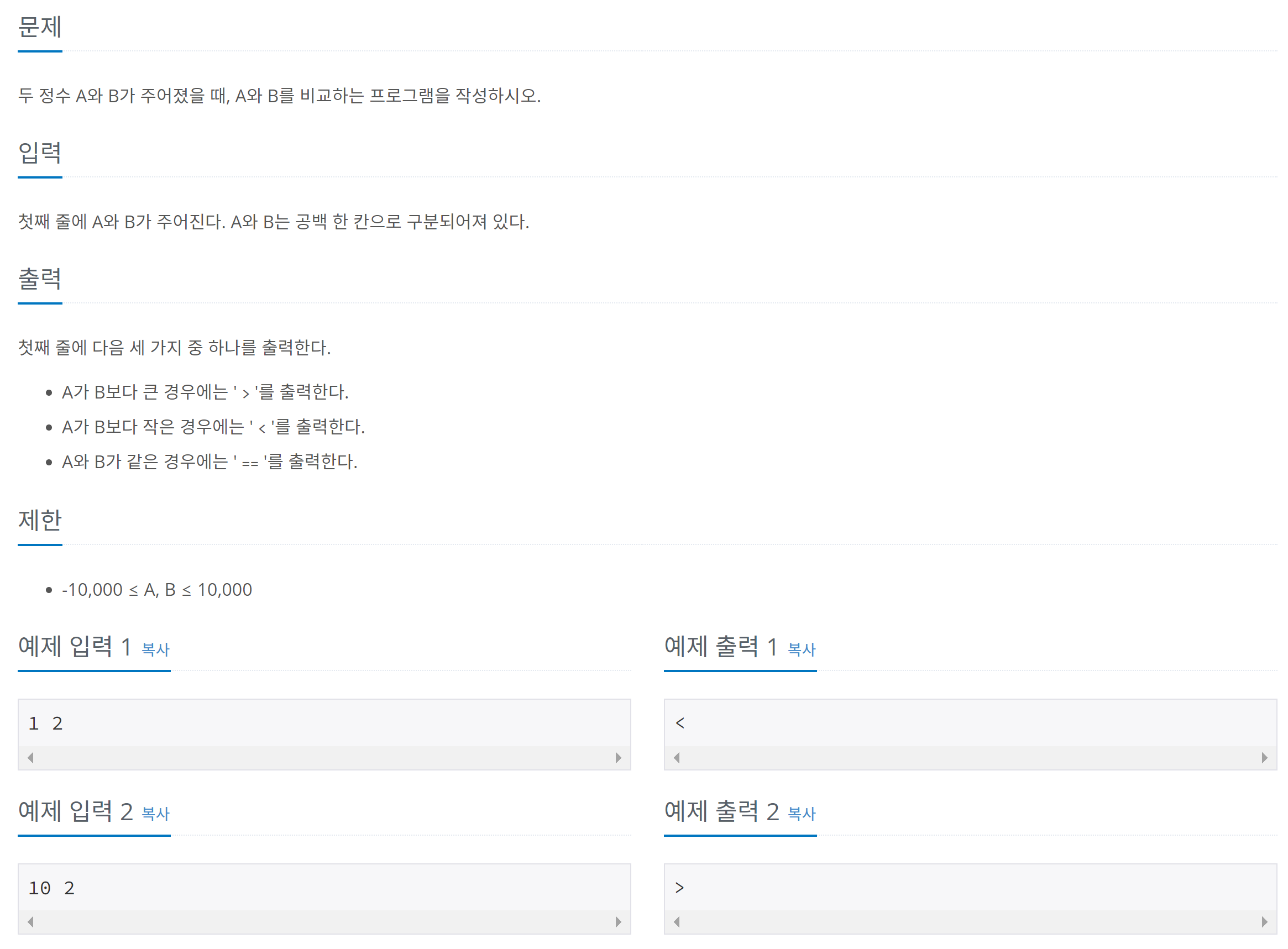 두 정수 A와 B가 주어졌을 때, A와 B를 비교하는 프로그램을 작성하시오.